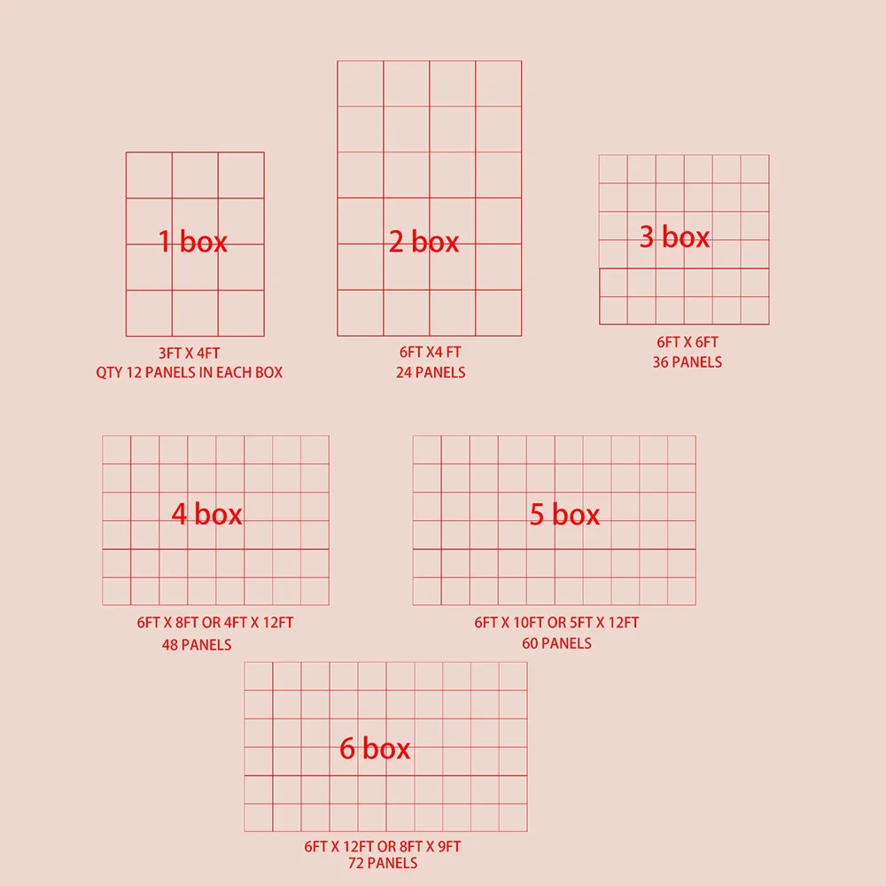 48 pcs(16+16+16)=6feet by 8feet=1.8m * 2.4m
