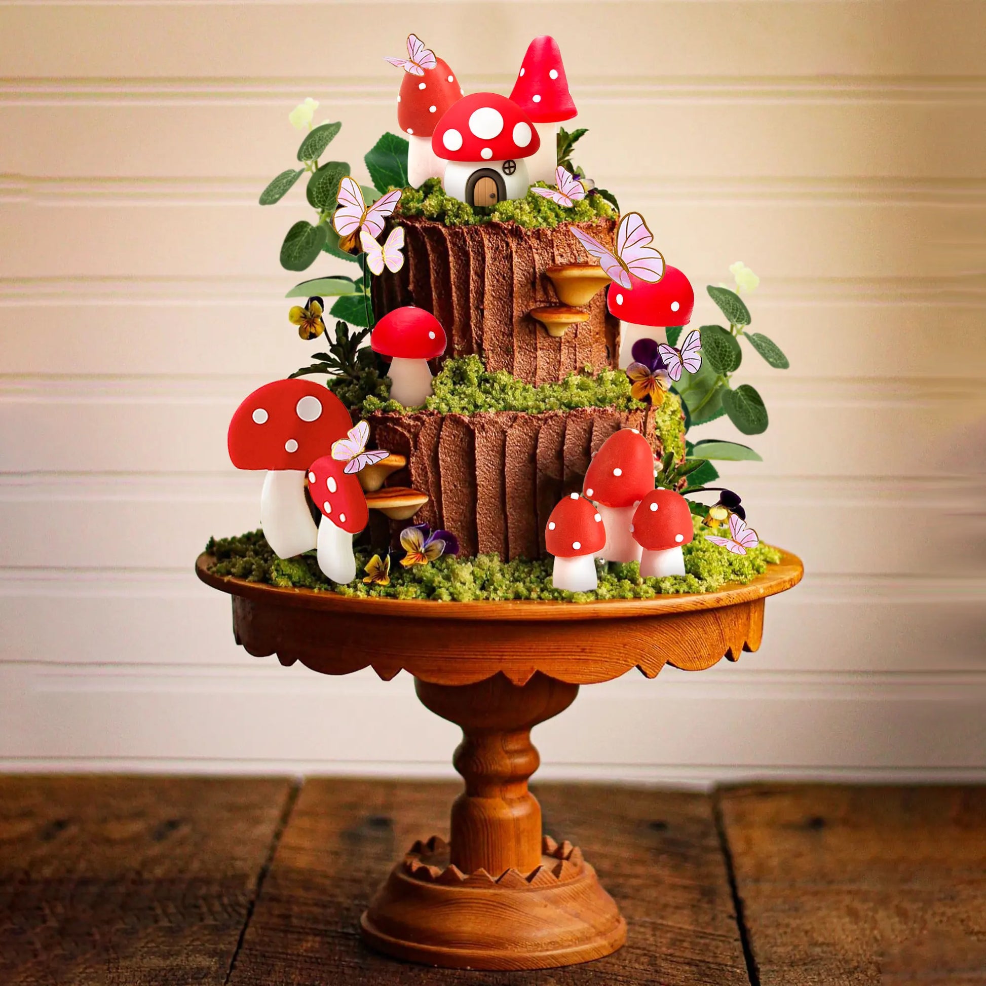 Röd: 7 x stora svampar, 2 x små svampar, 10 x fjärilar, 4 x gröna blad, 1 x svamphus.